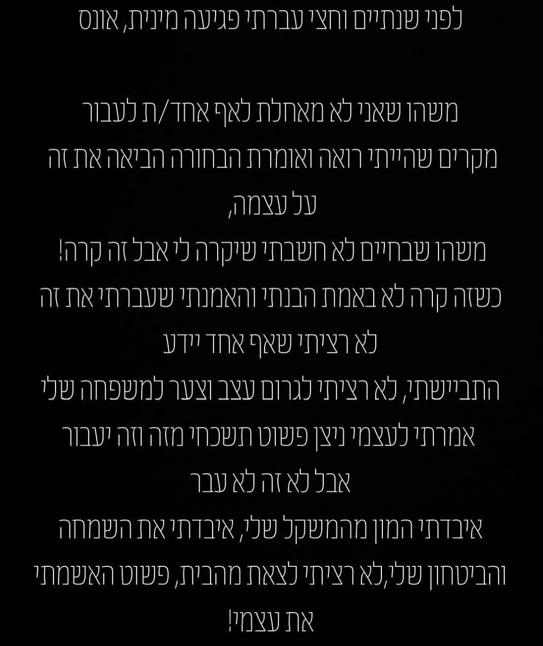 "אני מסתובבת כבר שנתיים וחצי עם סוד שמעטים מאוד האנשים יודעים," פתחה מדנס את דבריה בפוסט המטלטל. "התביישתי. אבל עכשיו אני מרגישה שאני צריכה לפתוח עם עצמי דף חדש, להילחם על האושר והביטחון שלי ולהפסיק לפחד ממה שאנשים יגידו, כי מגיע לי!".