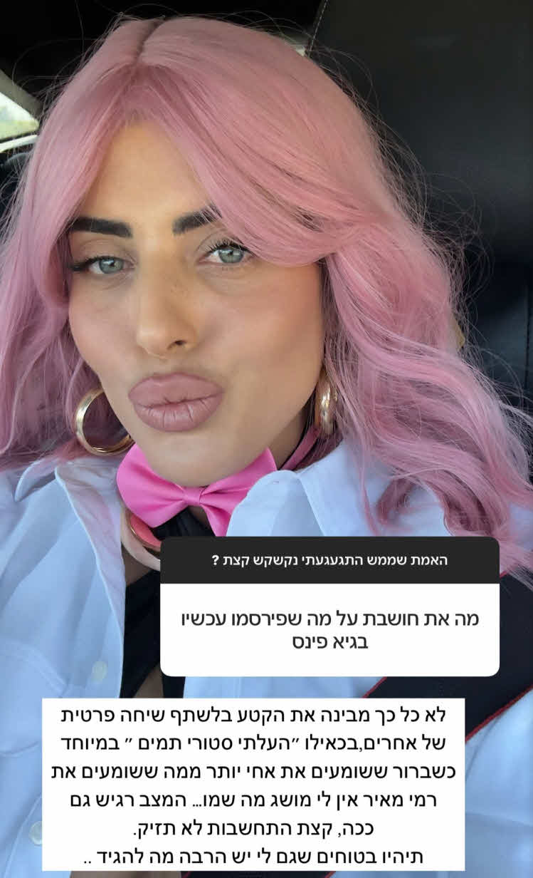 "לא כל כך מבינה את הקטע בלשתף שיחה פרטית של אחרים, בכאילו 'העליתי סטורי תמים', במיוחד כשברור ששומעים את אחי יותר מאשר את רמי מאיר – אין לי מושג מה שמו… המצב רגיש גם ככה, קצת התחשבות לא תזיק. תהיו בטוחים שגם לי יש הרבה מה להגיד."