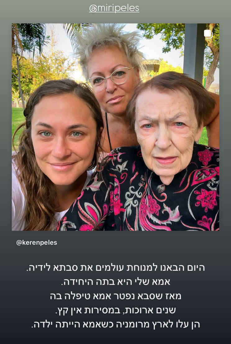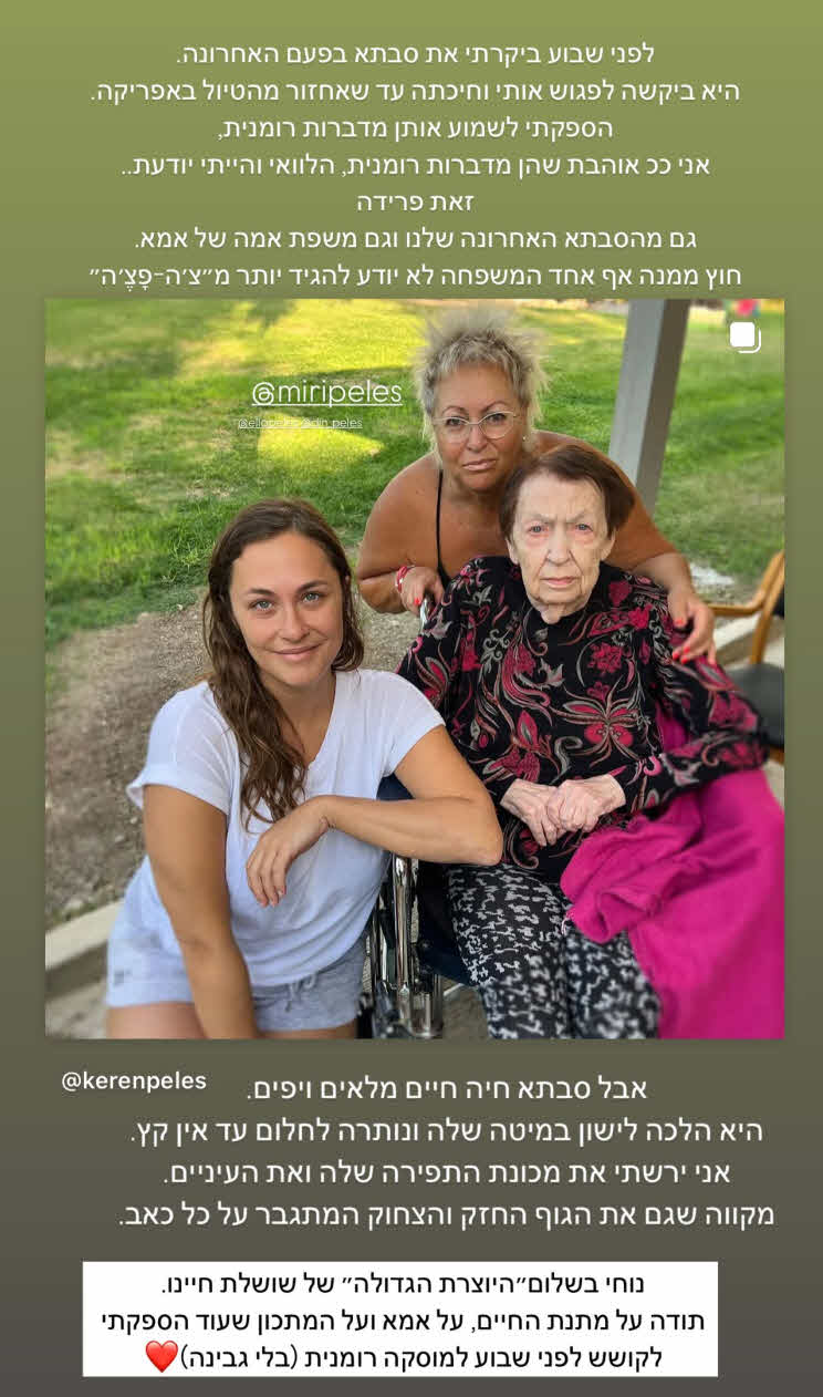 "היום הבאנו למנוחת עולמים את סבתא לידיה", כתבה לעוקביה. "אמא שלי היא בתה היחידה. מאז שסבא נפטר – היא טיפלה בה במסירות אין קץ. הן עלו לארץ מרומניה כשאמא הייתה ילדה." פלס, שתמיד ידעה לשלב בין רגש אישי להקשרים רחבים יותר, המשיכה לתאר רגעים של אינטימיות משפחתית שקשה להישאר אליהם אדישים.
