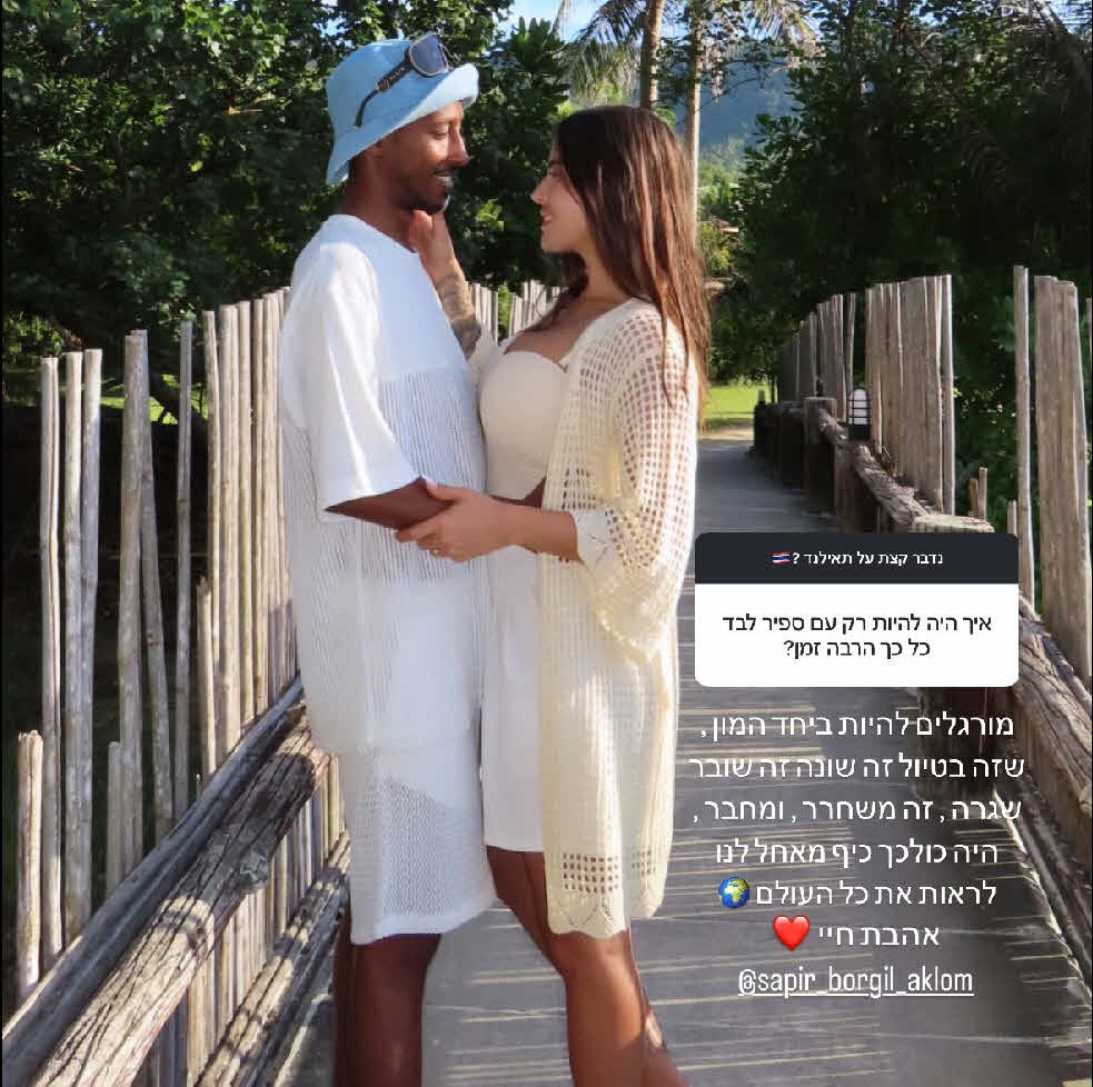 ספיר, שתיעדה לא מעט מהרגעים בתאילנד, הוצפה בפניות מעוקביה שביקשו המלצות על מלונות, מסעדות, חופים אקזוטיים וספא חלומי. היא נענתה לרוב הבקשות, העלתה סטוריז ולמעשה הפכה לרגע למדריכת טיולים אישית עם גלאם. אבל השאלה המעניינת באמת כוונה לבן הזוג אברהם – איך זה לבלות כל כך הרבה זמן לבד עם ספיר, בלי הסחות דעת ובלי הפסקות?