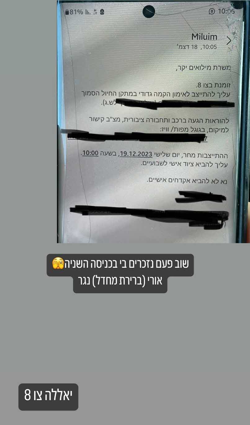 במכתב שנמסר לאורי ואותו שיתף בסטורי ברשת האינסטגרם נכתב "זומנת בצו 8, עליך להתייצב לאימון הקמה גדודי במתקן החיול הסמוך". עוד נכתב כי הזימון הוא למחר(שלישי) ועליו להביא ציוד אישי לשבועיים שכולל גם אקדחים אישיים.