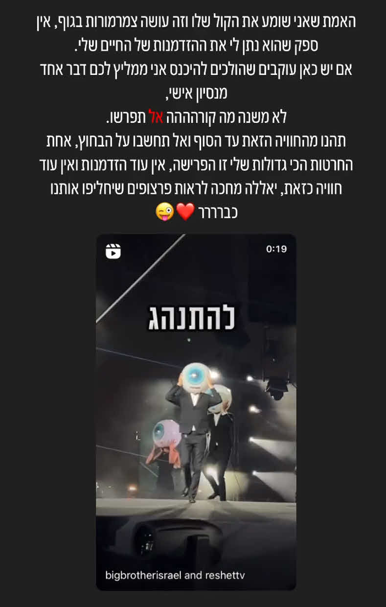 נגר הוסיף: "אם יש כאן עוקבים שהולכים להיכנס, אני ממליץ לכם דבר אחד מניסיון אישי, לא משנה מה קורה – אל תפרשו. תהנו מהחוויה הזאת עד הסוף ואל תחשבו על הבחוץ".