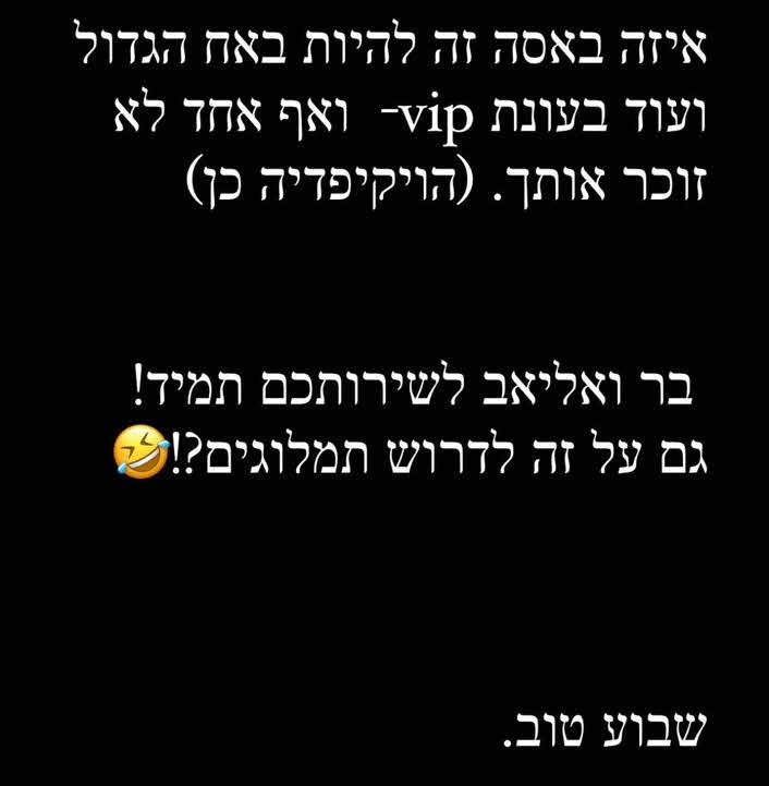 "איזה באסה זה להיות באח הגדול ועוד בעונת VIP ואף אחד לא זוכר אותך." והוסיף בזלזול: "הויקיפדיה כן?". לאחר מכן סיכם: "בר ואליאב לשירותכם תמיד! גם על זה לדרוש תמלוגים?! שבוע טוב".
