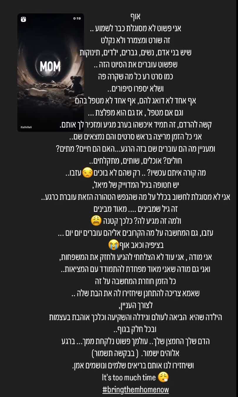 "ומעניין מה הם עוברים שם בזה הרגע… האם הם חיים? מתים? חולים? אוכלים, שותים, מתקלחים.. מה קורה איתם עכשיו? רק שהם לא בוכים, עזבו. יש חטופה בגיל המדויק של מיאל, אני לא מסוגלת לחשוב בכלל על מה שהנפש הטהורה הזאת עוברת כרגע."