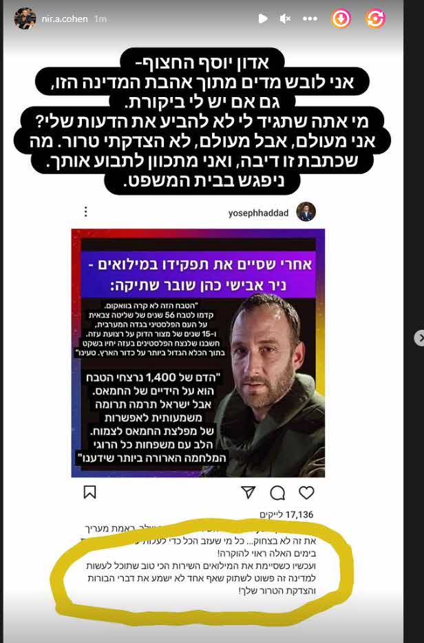 יוסף חדאד החליט לשתף את הפוסט וחלק מדבריו של ניר אבישי כהן לצד ביקורת חריפה שהפנה אליו. תחילה הוא כתב: "תודה על השירות מילואים שלך, באמת מעריך את זה לא בצחוק… כל מי שעזב הכל כדי לעלות על מדים ולשרת בימים האלה ראוי להוקרה!"