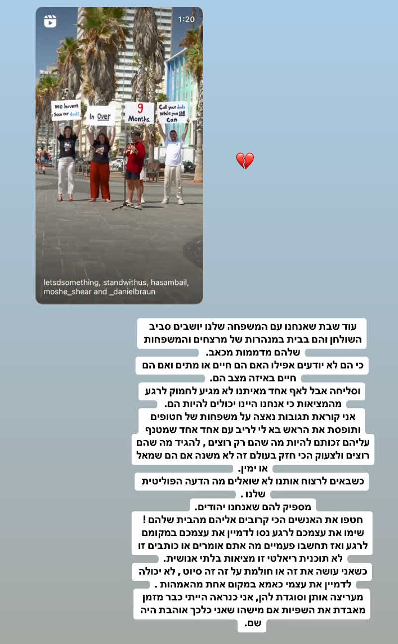 והוסיפה בכאב: "אני קוראת תגובות נאצה על משפחות של חטופים ותופסת את הראש. בא לי לריב עם אחד אחד שמטנף עליהם. זכותם להיות מה שהם רוצים, להגיד מה שהם רוצים ולצעוק הכי חזק בעולם. זה לא משנה אם הם שמאל או ימין".