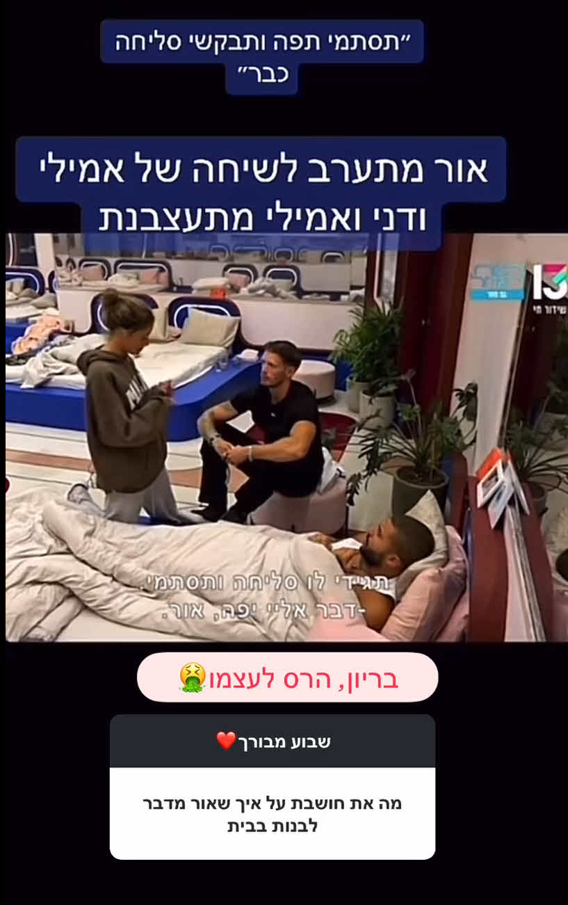 אמילי צודקת אור ערס ביריון ואלים ואסור לשתוק כולנו צריכים לעשות חרם על התכנית ולא לצפות עד שאור יעוף גם את שי חי העיפו על אלימות אז אור לא שונה משי חי כל היום מסתובב כמו שייח מחלק הוראות ומטיל פחד ואימה על כולם…גועל נפש שיעוף הביתה יחד עם מיכל הקנאית האובססיבית והרכלנית נדבקה לאור כמו עלוקה…