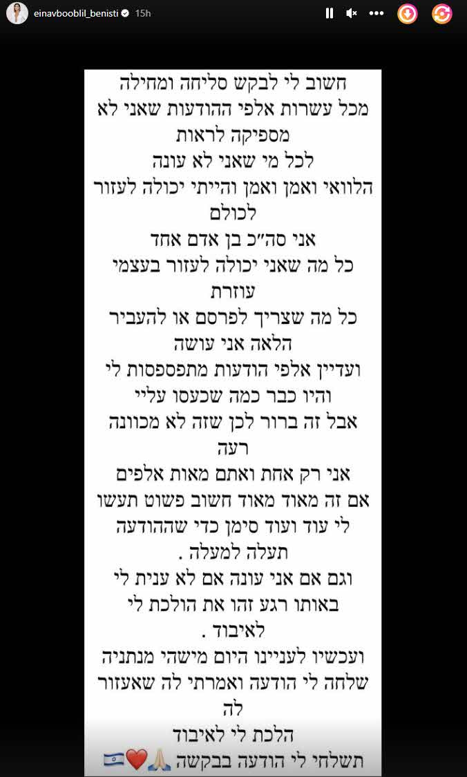 בובליל החליטה לפתוח בפני עוקביה כיצד היא קורסת תחת עומס ההודעות והפניות שהיא מקבלת: "חשוב לי לבקש סליחה ומבחילה מכל עשרות אלפי ההודעות שאני לא מספיקה לראות. לכל מי שאני לא עונה, הלוואי ואמן ואמן והייתי יכולה לעזור לכולם".