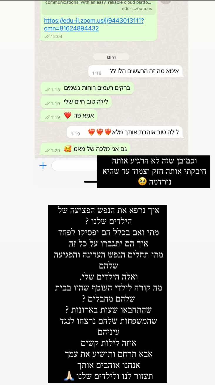 "איך הם יתגברו על כל זה? מתי תחלים הנפש העדינה והפגיעה שלהם? ואלה הילדים שלי. מה קורה לילדי העוטף שהיו בבית שלהם מחבלים? שהתחבאו שעות בארונות? שהמשפחות שלהם נרצחו לנגד עיניהם? איזה לילות קשים. אבא תרחם ותושיע את עמך. אנחנו אוהבים אותך, תעזור לנו ולילדים שלנו".