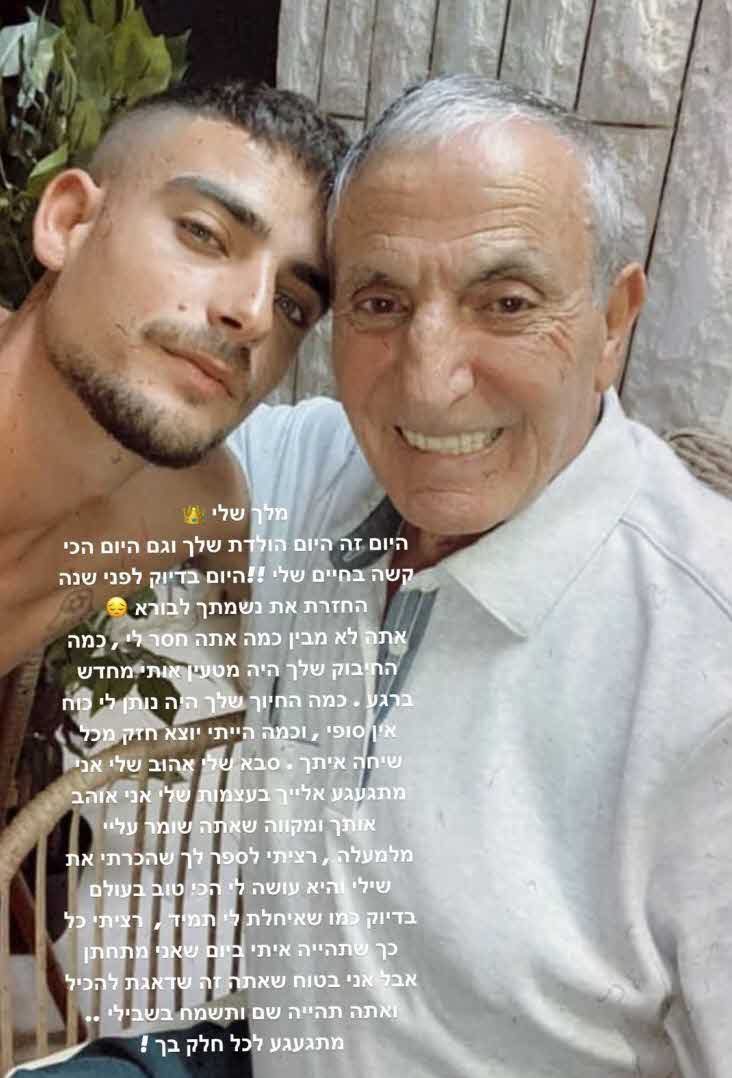 "סבא שלי, אהוב שלי, אני מתגעגע אלייך בעצמות שלי. אני אוהב אותך ומקווה שאתה שומר עלי מלמעלה. רציתי לספר לך שהכרתי את שילי והיא עושה לי הכי טוב בעולם".