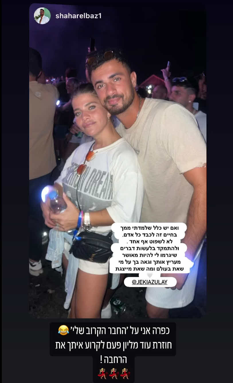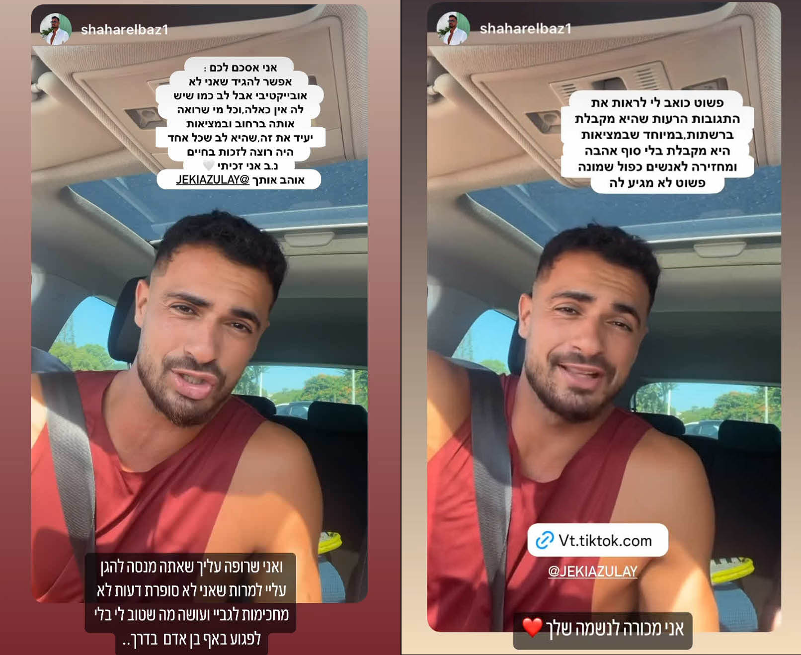 חברה הקרוב של ג'קי שמתועד איתה בסרטון המדובר, שחר אלבז, החליטה לצאת לשרשרת של סטוריז שבו יצא להגנתה: "פשוט כואב לי לראות את התגובות הרעות שהיא מקבלת ברשתות. במיוחד שבמציאות היא מקבלת בלי סוף אהבה ומחזירה לאנשים כפול שמונה, פשוט לא מגיע לה".