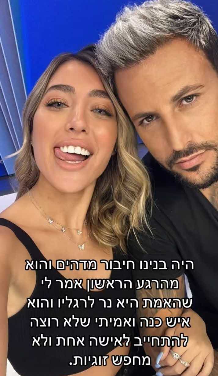 "סיכמנו לא להתחייב ולהיות חברים טובים שנהנים מהחיים. ביקשת ממנו להמשיך להיות דמות אצלי ברשתות החברתיות והוא הסכים רק בתנאי שאצלו במדיה וגם שאנחנו ביחד להציג את האמת בלבד. הסכמתי לו, הוא הסכים לי ויצאנו לדרך".