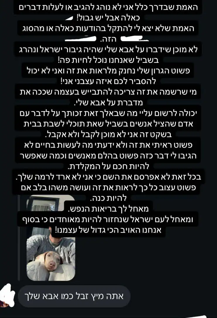 בהמשך הוסיף ופתח את ליבו בצורה כנה: "פשוט הגרון שלי נחנק מלראות את זה, ואני לא יכול להסביר לכם איזה עצבני אני! מי שרשמה את זה צריכה להתבייש בעצמה; שככה את מדברת על אבא שלי. יכולה לרשום עליי מה שבא לך, זאת זכותך. אבל לדבר על אדם שהציל אנשים בשביל שאת תוכלי לשבת בבית בשקט, את זה אני לא מוכן לקבל, ולא אקבל."