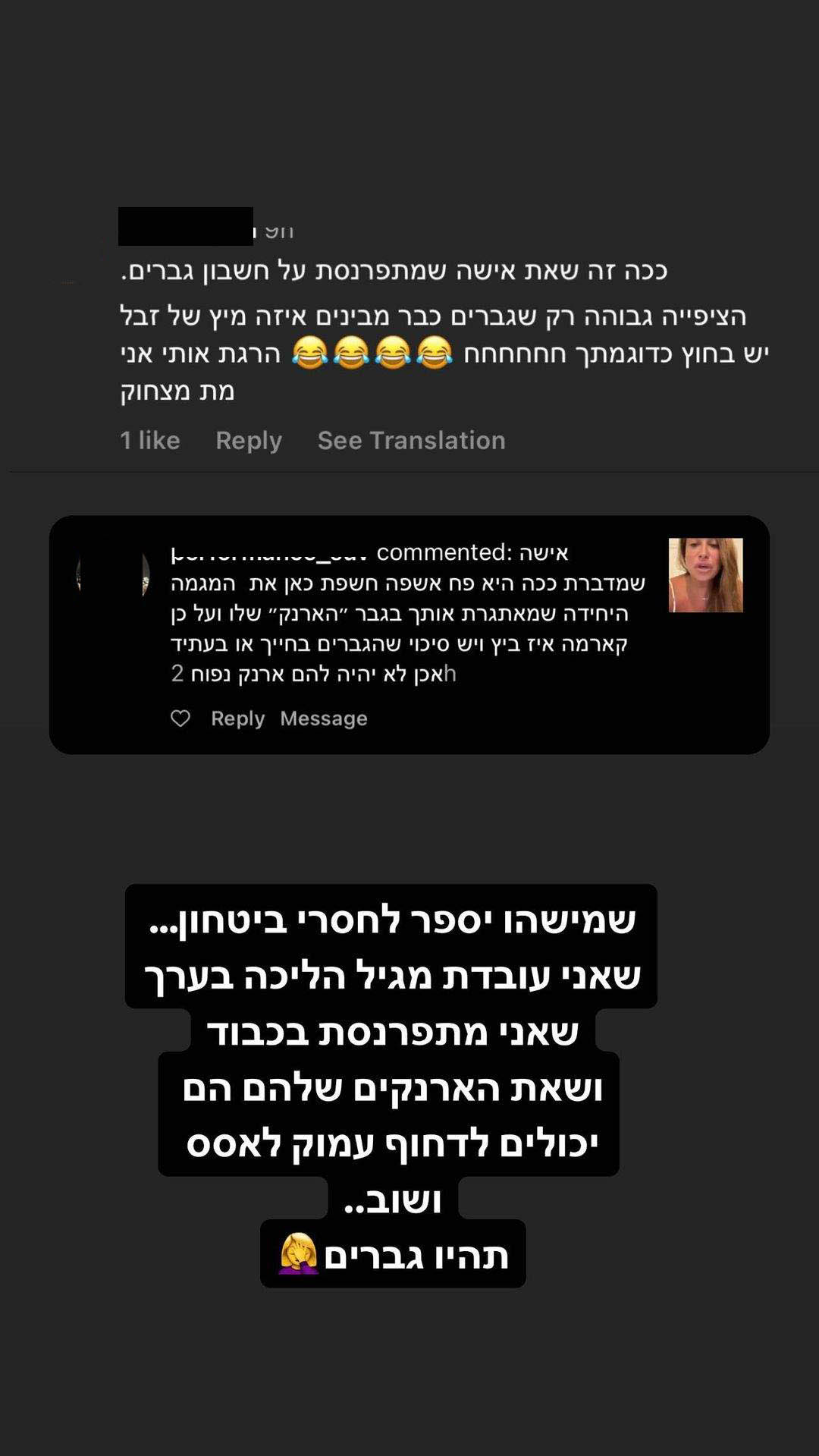 לאחר מכן חשפה תגובות שחטפה מגברים על הקטע:"ככה זה שאת אישה שמתפרנסת על חשבון גברים. הציפייה גבוהה רק שגברים כבר מבינים איזה מיץ של זבל יש בחוץ כדוגמתך חחח הרגת אותי, אני מת מצחוק" כתב אחת מהם.