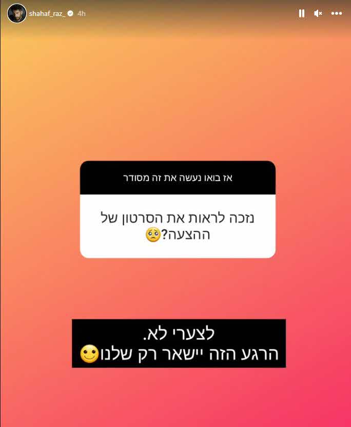 אני לא מבינה מה הבעיה. זה רגע מרגש ואינטימי שלהם, וזכותם לחלוק עם העוקבים או לא. כפי שאנחנו מכירים את שחף הוא עשה את זה יפה ומרגש. והרבה הרבה מזל טוב!