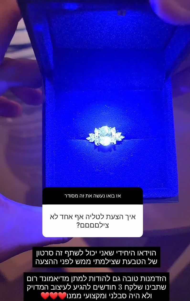 כסוג של פרס ניחומים, שחף שיתף איך נראית הטבעת מקרוב מבעד לקופסה הנוצצת רגע לפני שהציע לטליה נישואים:"הווידאו היחידי שאני יכול לשתף זה סרטון של הטבעת שצילמתי ממש לפני ההצעה."
