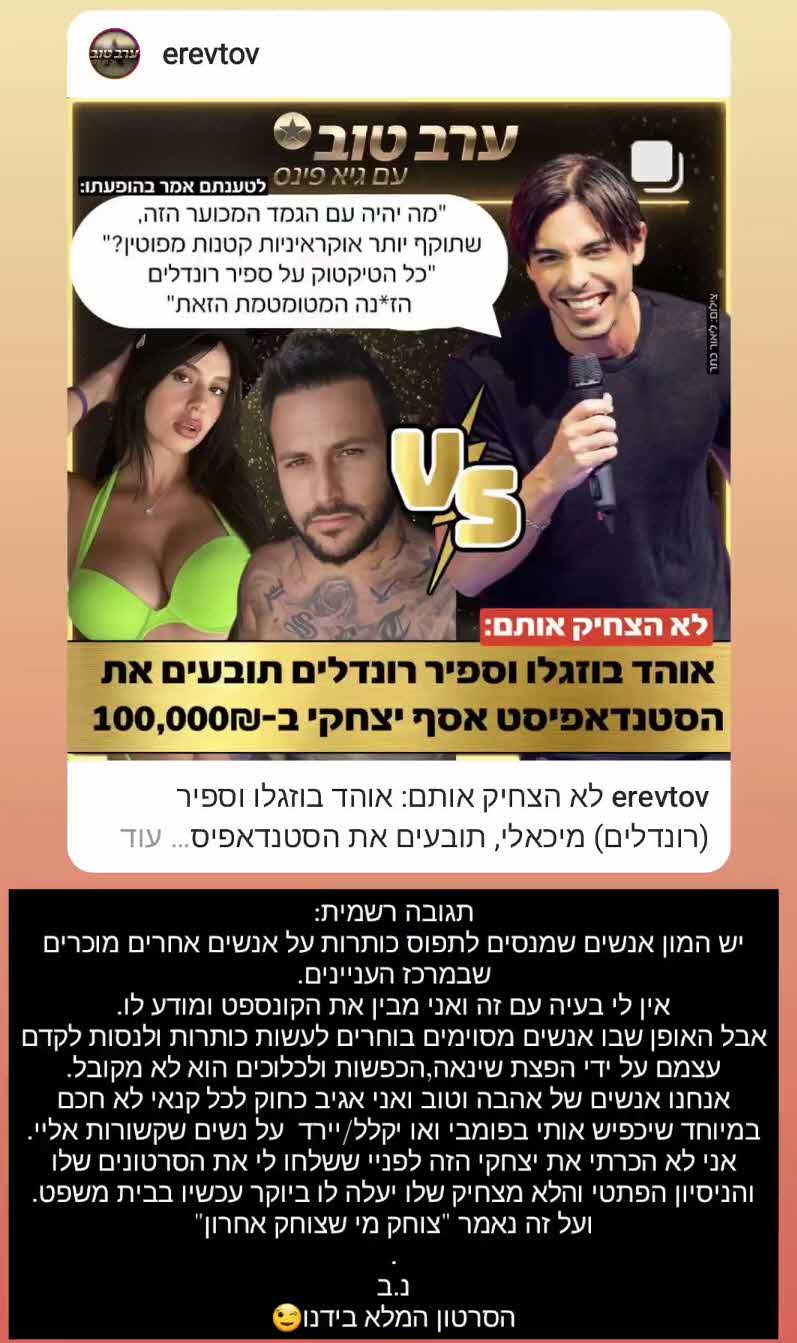 אוהד בוזגלו החליט להגיב על כך בסטורי שלו באופן רשמי:"יש המון אנשים שמנסים לתפוס כותרות על אנשים אחרים מוכרים שבמרכז העניינים. אין לי בעיה עם זה ואני מבין את הקונספט ומודע לו. אבל האופן שבו אנשים מסוימים בוחרים לעשות כותרות ולנסות לקדם עצמם על ידי הפצת שינאה,הכפשות ולכלוכים הוא לא מקובל."