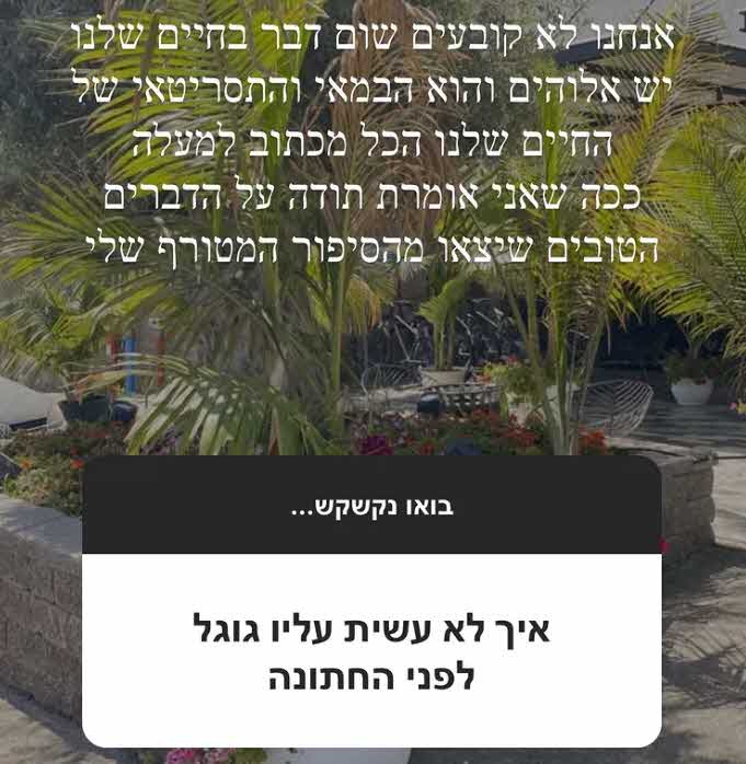 עוד שאלה אליה החליטה להתייחס טהוניה בדבר האקס:"איך לא עשית עליו גוגל לפני החתונה?". טהוניה מסרה בנושא:"אנחנו לא קובעים שום דבר בחיים שלנו. יש אלוהים והוא הבמאי והתסריטאי של החיים שלנו הכל מכתוב מלמעלה ככה שאני אומרת תודה על הדברים הטובים שיצאו מהסיפור המטורף שלי."