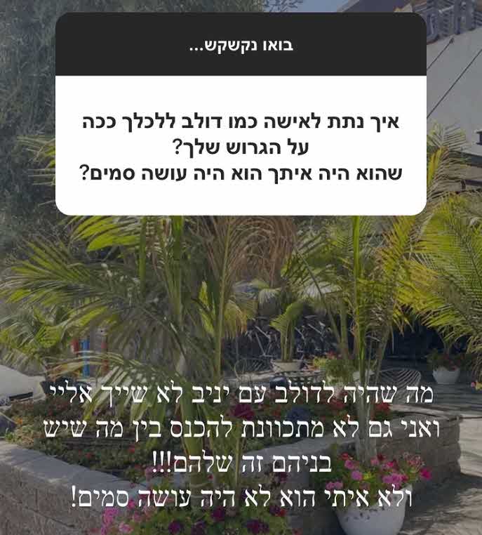 טהוניה החליטה לענות לשאלות העוקבים בסטורי בנוהל, ובאופן מעט יוצא דופן מהרגיל החליטה להתייחס הפעם גם לנושאים הקשורים לבעלה לשעבר ולדולב סאלם. טהוניה נשאלה:"איך נתת לאישה כמו דולב ללכלך ככה על הגרוש שלך? שהוא היה איתך הוא היה עושה סמים?"