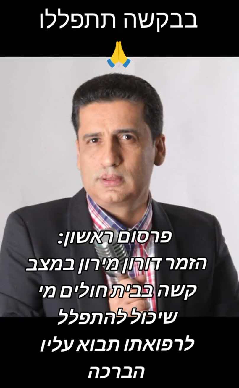 על פי הדיווחים הראשונים אמש, דורון מירן פונה לבית החולים כאשר מצבו יציב. מנגד, חברו של הזמר – תמיר סולטנה שבילה לצידו לא מעט על הבמות במהלך הקריירה החליט לשתף אתמול מסר קצת יותר מדאיג ברשת הטיקטוק וכתב:"פרסום ראשון: הזמר דורון מירן במצב קשה בבית חולים. מי שיכול להתפלל לרפואתו תבוא עליו הברכה".
