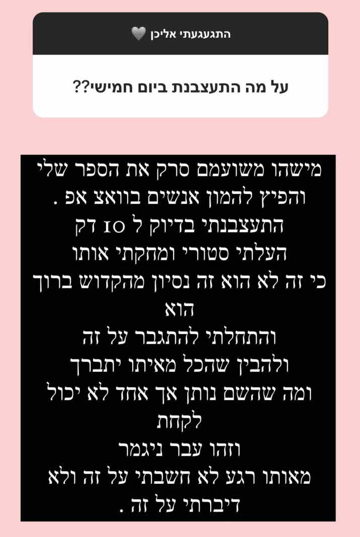 עוד דבר שמאוד הצליח לסקרן את העוקבים היה סטורי עצבני שבובליל העלתה ומחקה, עינב חשפה את הסוגיה:"מישהו משועמם סרק את הספר שלי והפץ להמון אנשים בוואטסאפ. התעצבנתי בדיוק ל-10 דקות. העלתי סטורי ומחקתי אותו כי זה לא הוא, זה נסיון מהקדוש ברוך הוא."