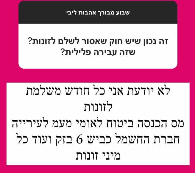 "זה נכון שיש חוק שאסור לשלם לזונ*ות? שזו עבירה פלילית?" לינור לא התבלבלה והשיבה:"לא יודעת, אני כל חודש משלמת לזונ*ות מס הכנסה, ביטוח לאומי, מע'מ, לעירייה, חברת החשמל, כביש 6, בזק ועל כל מיני זונ*ות".