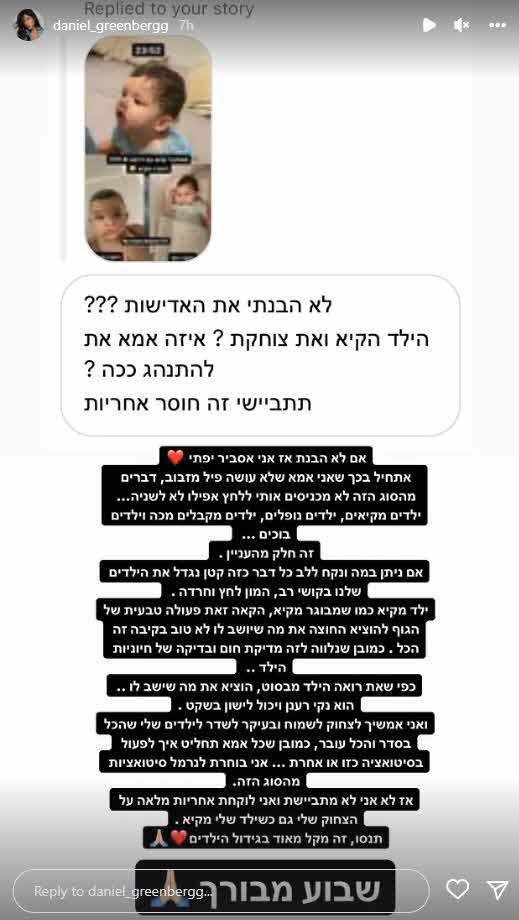 דניאל כתבה:"אם לא הבנת אז אני אסביר יפתי. אתחיל בכך שאני אמא שלא עושה פיל מזבוב, דברים מהסוג הזה לא מכניסים אותי ללחץ אפילו לשנייה… ילדים מקיאים, ילדים נופלים, ילדים מקבלים מכה וילדים בוכים… זה חלק מהעניין"