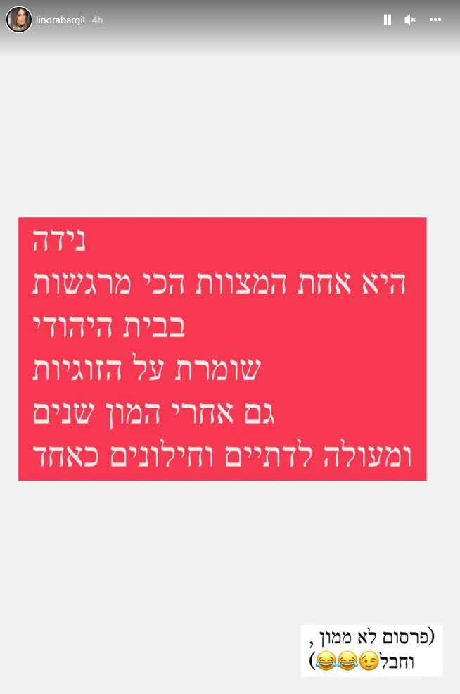 "אני משתפת בחוויה אישית שלי את כל העוקבים כמו בכל מה שעובר עלי בחיים. וכל אלה ששומרות נידה בתשלום, זה מביך. סורי. ובנימה הומוריסטית, אני 'בנידה' שנים רבות מבחירה, לא מקימים יחסים ללא אהבה, אין 'מקווה לנפש'"