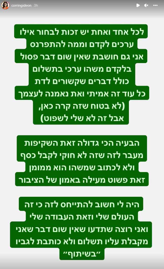 "לכל אחד ואחת יש זכות לבחור אילו ערכים לקדם וממה להתפרנס. אני גם חושבת שאין שום דבר פסול בלקדם משהו ערכי בתשלום כולל דברים שקשורים לדת כל עוד זה אמיתי ואת נאמנה לעצמך(לא בטוח שזה קרה כאן, אבל זה לא שלי לשפוט)".