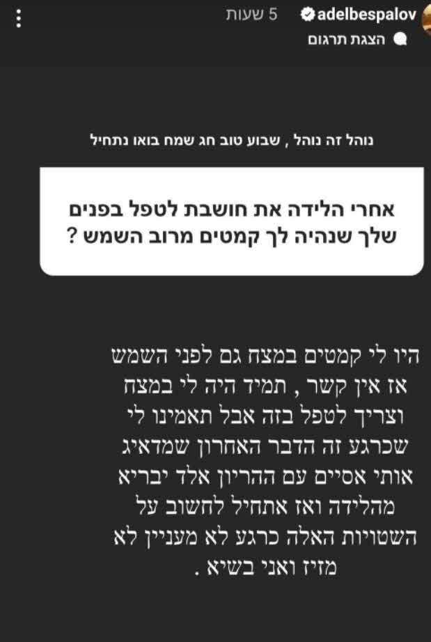 אדל עצמה כבר הספיקה להתייחס לנושא השיזוף והכתמים בפנים מהשמש בסטורי שלה:"היו לי קמטים במצח גם לפני השמש אז אין קשר, תמיד היה לי במצח וצריך לטפל בזה אבל תאמינו לי שכרגע זה הדבר האחרון שמדאיג אותי."