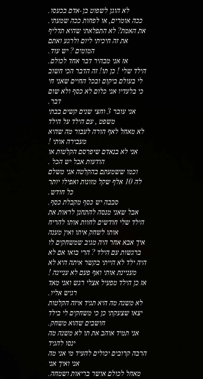 "אני עובר 3 וחצי שנים קשים בבתי משפט, עם הילד על הילד. לא מאחל לאף הורה לעבור מה שהיא מעבירה אותי! אני לא בנאדם שיפרסם הקלטות או הודעות אבל יש הכל. וכמו ששמעתם בהקלטה. אני משלם לה 10 אלף שקל מזונות ואפילו יותר כל חודש. סבבה יש כסף מקבלת כסף. אבל שאני מנסה להתחנן לראות את הילד שלי חודשים. לחוות אותו, להריח אותו, לשחק איתו ואין מענה. איך אבא אחר היה מגיב שמשחקים לו ברגשות עם הילד?"