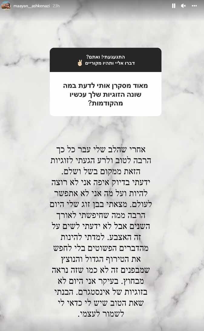 "בעיקר אני היום לא בזוגיות של אינסטגרם" – חתמה מעיין בסוג של רמיזה אולי לקשר הקודם. וסיימה במשפט:"הבנתי שאת הטוב שיש לי כדאי לי לשמור לעצמי". אך זו לא הייתה השאלה היחידה שסקרנה.