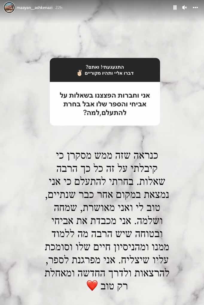 עוד הוסיפה מעיין תגובה בהקשר לספר החדש של אביחי, נושא שהצליח לסקרן רבים מעוקביה:"כנראה שזה ממש מסקרן כי קיבלתי על זה כל כך הרבה שאלות. בחרתי להתעלם כי אני נמצאת במקום אחר כבר שנתיים."