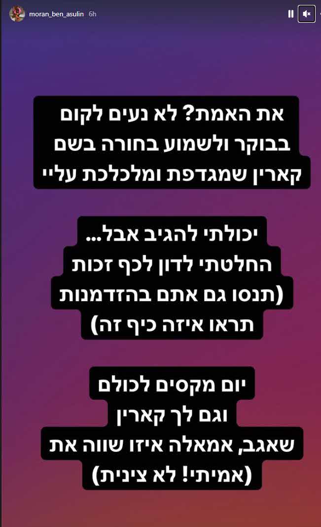 מורן בן אסולין הגיבה לדברים של קארין:"את האמת? לא נעים לקום בבוקר ולשמוע בחורה בשם קארין שמגדפת ומלכלכת עליי. יכולתי להגיב אבל… החלטתי לדון לכף זכות(תנסו גם אתם בהזדמנות תראו איזה כיף זה). יום מקסים לכולם וגם לך קארין שאגב, אמאלה איזו שווה את"