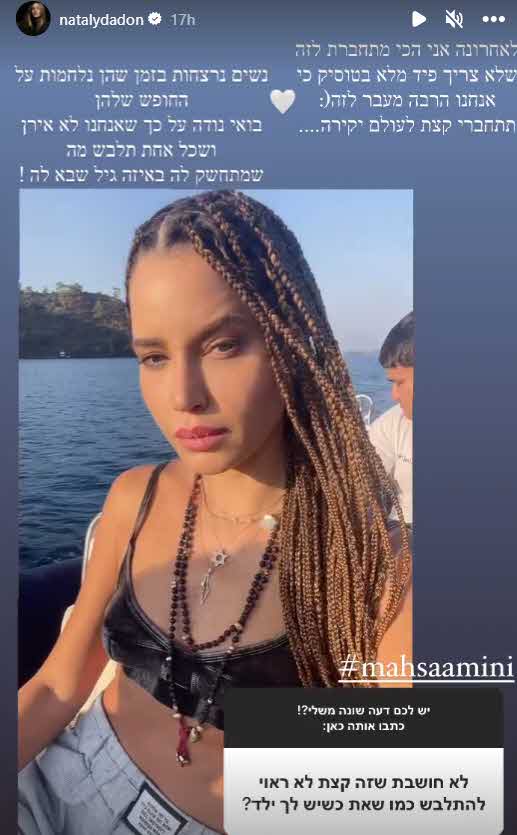 "לאחרונה אני הכי מתחברת לזה שלא צריך פיד מלא בטוסיק כי אנחנו הרבה מעבר לזה. תתחברי קצת לעולם יקירה.. נשים נרצחות בזמן שהן נלחמות על החופש שלהן. בואי נודה על כך שאנחנו לא אירן ושכל אחת תלבש מה שמתחשק לה באיזה גיל שבא לה!"