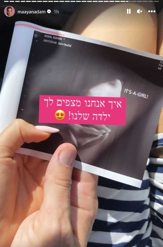 אדם שמרבה לשתף את עוקביה בכל המתרחש בהריונה ואף לחלק לא מעט טיפים החליטה לחשוף היום את מין העובר, בת בכורה ראשונה. מעיין התלוצצה רגע לפני החשיפה:"מה שכן העובר לא הפסיק להשתולל בבטן וממש הקשה על הצילום. באיזשהו שלב גם הרופא קרא לו קפצון… ומילא הבעיטות שאני הולכת לחטוף לכליות, אני מתה מפחד שהיא תצא עם האופי שלי."