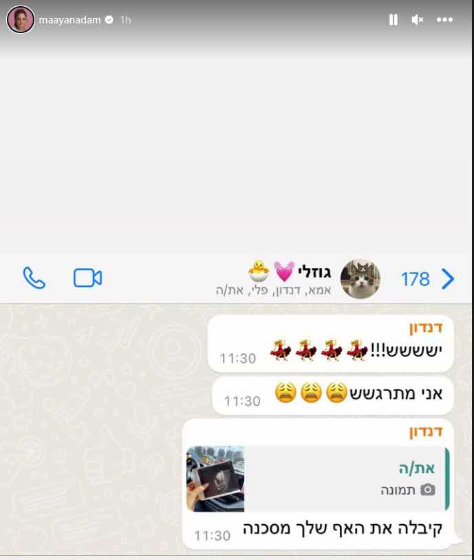 אדם שנמצאת כיום בזוגיות מתמשכת עם יובל צ'לנר, החליטה לחשוף עוד רגע משעשע מקבוצת הוואטסאפ המשפחתית כאשר אחת המשתתפות כתבה לה בעקבות חשיפת צילום האולטרסאונד:"קיבלה את האף שלך מסכנה".