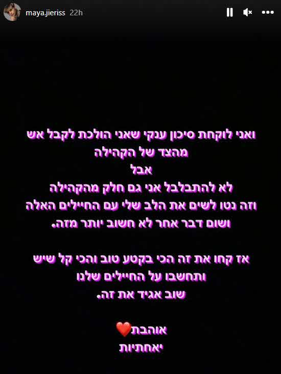 "אני לוקחת סיכון ענקי שאני הולכת לקבל אש מהצד של הקהילה אבל לא להתבלבל, אני גם חלק מהקהילה וזה נטו לשים את הלב שלי עם החיילים האלה ושום דבר אחר לא חשוב יותר מזה. אז קחו את זה הכי בקטע טוב והכי קל שיש ותחשבו על החיילים שלנו, שוב אגיד את זה" כתבה בין היתר.