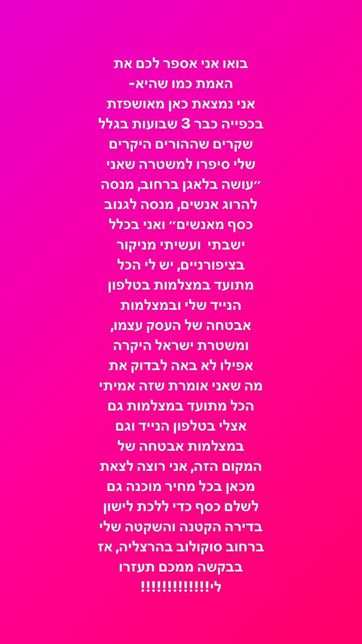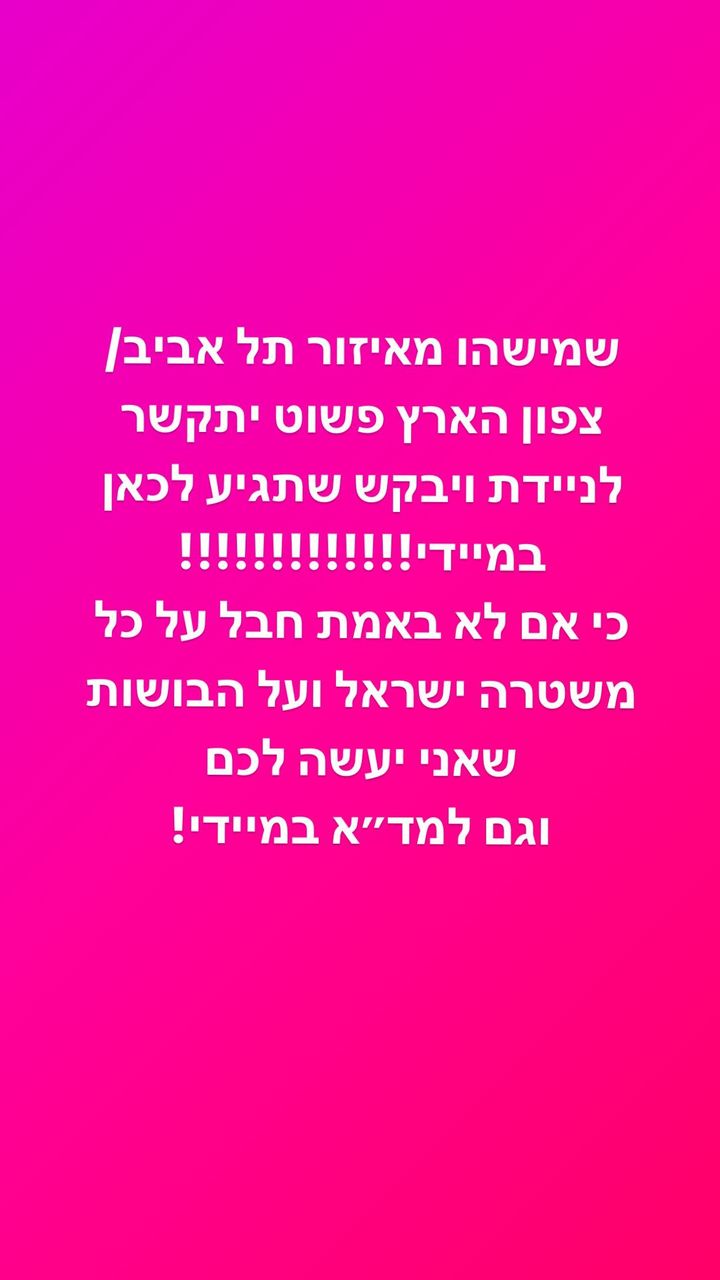 לאחר מכן העלתה סטורי מדאיג נוסף בו כתבה:"שמישהו מאיזור תל אביב/צפון הארץ יתקשר לניידת ויבקש שתגיע לכאן במיידי! כי אם לא באמת חבל על כך משטרת ישראל ועל הבושות שאני יעשה לכם וגם למד'א במיידי!"