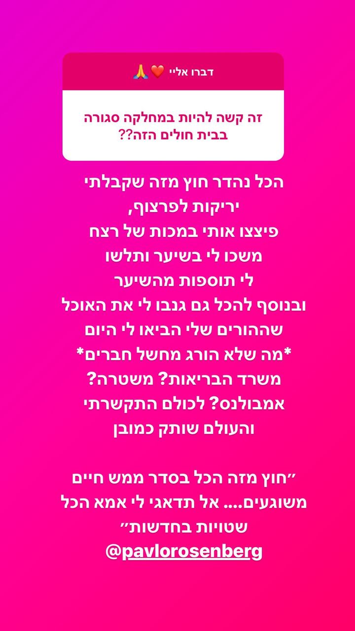 "הכל נהדר חוץ מזה שקבלתי יריקות לפרצוף, פיצצו אותי במכות רצח. משכו לי בשיער ותלשו לי תוספות מהשיער. ובנוסף להכל גם גנבו לי את כל האוכל שההורים שלי הביאו לי היום *מה שלא הורג מחשל חברים* משרד הבריאות? משטרה? אמבולנס? לכולם התקשרתי והעולם שותק כמובן".