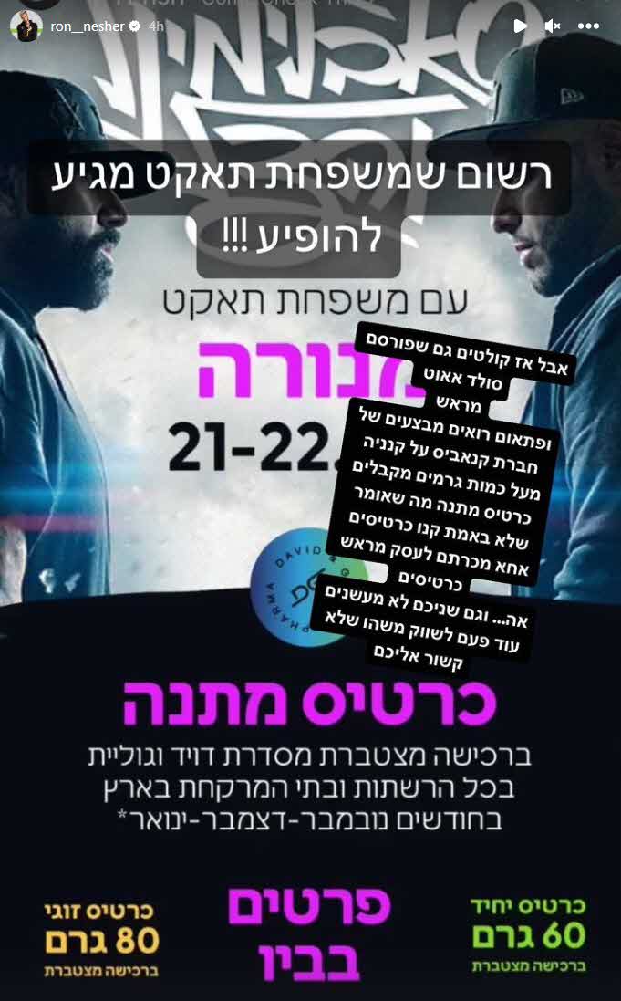 והוסיף:"ופתאום רואים מבצעים של חברת קנאביס על קנניה מעל כמות גרמים מקבלים כרטיס מתנה. מה שאומר שלא באמת קנו כרטיסים אלא מכרתם לעסק מראש כרטיסים. אה.. ושגם שניכם לא מעשנים, עוד פעם לשווק משהו שלא קשור אליכם."