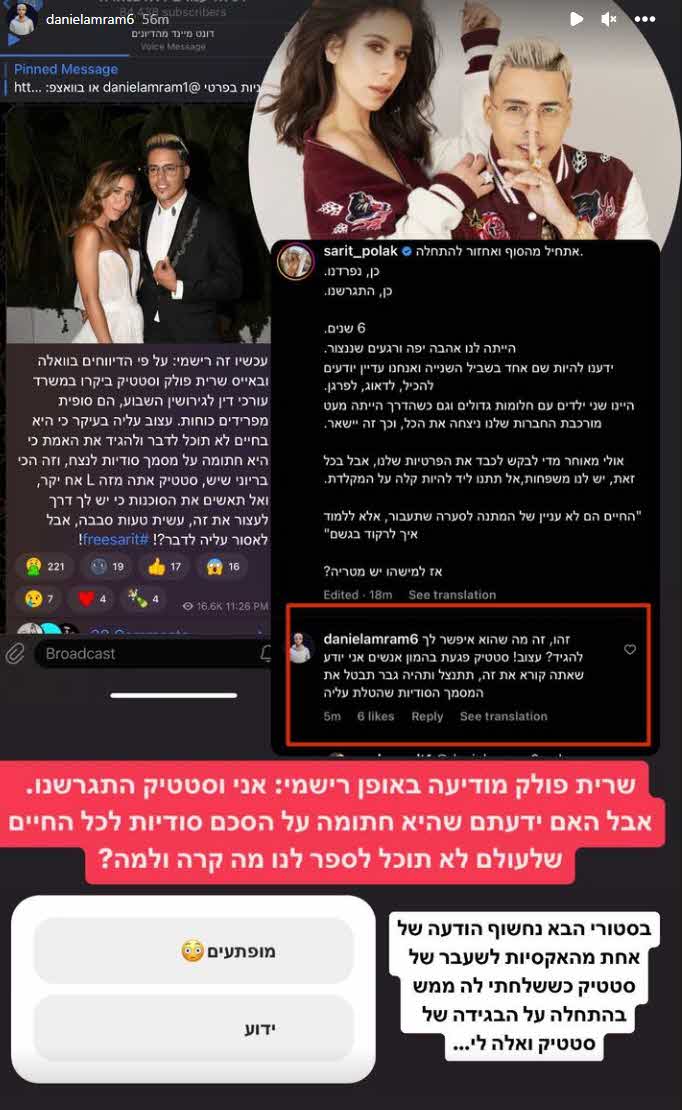 עמרם שיתף בין היתר בסטורי שלו:"שרית פולק מודיעה באופן רשמי: אני וסטטיק התגרשנו. אבל האם ידעתם שהיא חתומה על הסכם סודיות לכל החיים שלעולם לא תוכל לספר לנו מה קרה ולמה?" בסטורי נוסף אף העלה צילום מסך עם הודעה של אחת האקסיות לכאורה שכתבה דברים שהעלו תהיות לא פשוטות ומשך אנשים להצטרף למחאה שפתח באותו עניין.