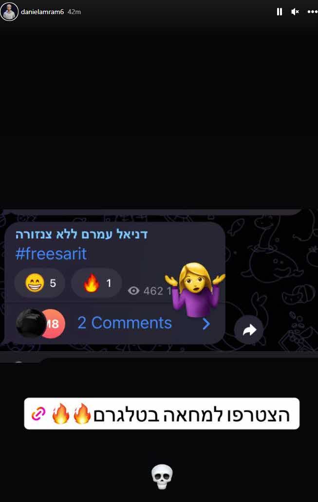 כוכב הטיקטוק דניאל עמרם שסיקר בעבר לא מעט מהפרשה הזוגית של השניים ברשתות החברתיות החליט לצאת במחאה ברשת הטלגרם הנקראת "#freesarit" ואף יצא בביקורת קשה בנושא לאחר הפוסט של שרית באינסטגרם.