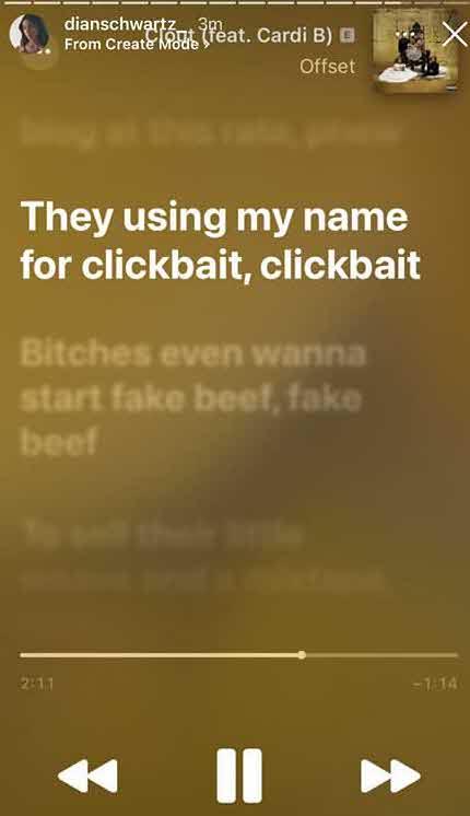 חדי העין שמו לב אולי לסטורי אותו העלתה דיאן אמש ונמחק אחרי מספר שניות ובו היה מסר שאולי חושף דווקא צד אחר ממה שכתבה בסטורי היום? דיאן העלתה ציטוט משירה של קארדי בי עם המילים(בתרגום חופשי לעברית):"הם משתמשים בשם שלי בשביל קליקבייט. הכלבות אפילו רוצות להתחיל ביף מזויף, ביף מזויף". אנחנו לגמרי מבולבלים כבר.