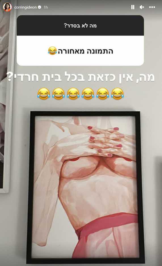 בתמונה שבצבצה ברגע הייתה תמונה אחרת אומנותית של אישה שמחזיקה את שדיה. קורין שמהרה להודות בפאדיחה שאלה את עוקביה "מה לא בסדר?" ולאחר מכן חשפה את התמונה וכתבה:"מה, אין כזאת בכל בית חרדי?". עכשיו כנראה כבר יש.