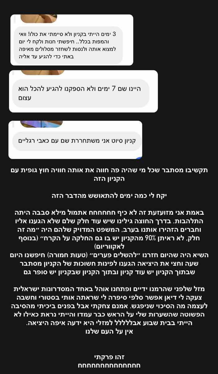 והמשיכה בתיאורים המטרידים:"באמת אני מזועזעת זה לא כיף חחחח אתמול מילא סבבה היתה התלהבות. בדרך החוצה גילינו שיש עוד חלק שלם שלא הגענו אליו וחברים הזהירו אותנו בערב, המשפט המדויק שלהם היה 'מה זה חלק. לא ראיתן 90% מהקניון, יש בו גם החלקה על הקרח'".