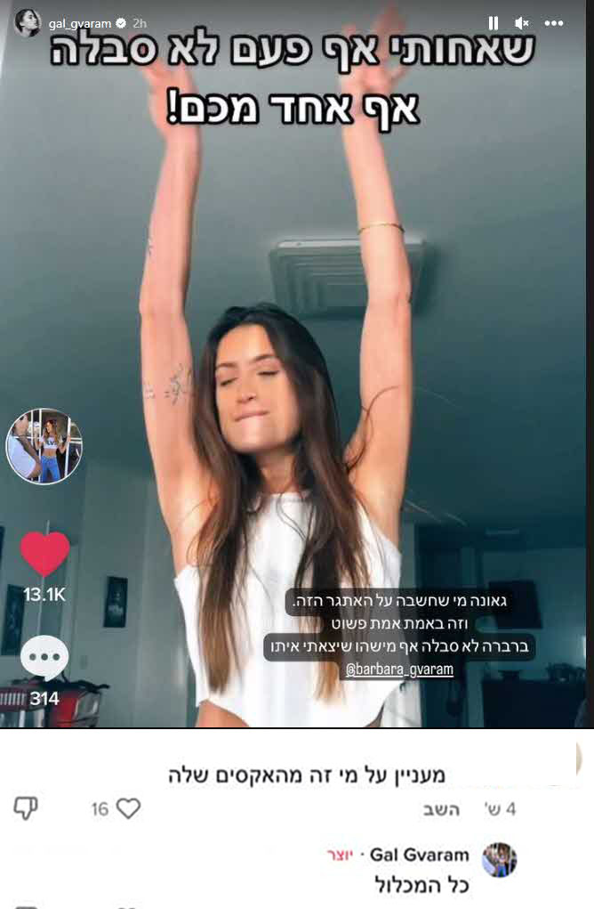 יוצאת הריאלטי, גל גברעם החליטה להעלות לרשת הטיקטוק סרטון שלה שברקע שירה של חברתה, שירה מרגלית – "אחותי כבר לא סובלת אותך". רק שאת מילות השיר היא החליפה במילים שתואמות להיסטוריה המשותפת שלה לכאורה עם בני הזוג לשעבר.