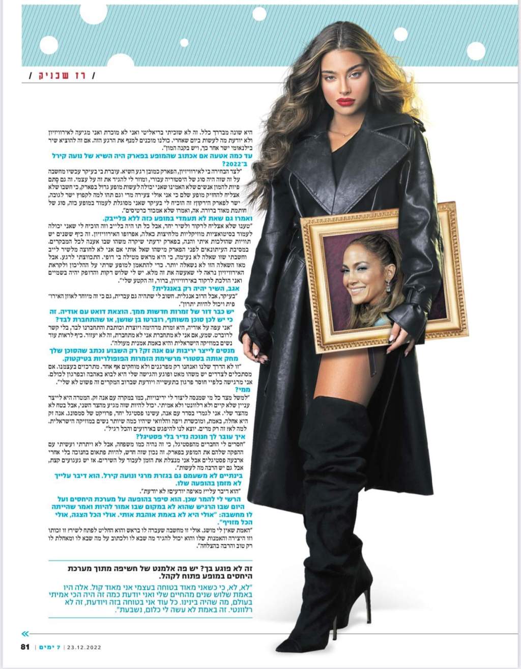 "אבל מאז השאלה הזו לא נשאלה יותר. כדי להתאמן למופע שרתי על ההליכון ולקראת האירוויזיון נראה לי שאעשה את זה מלא. יש לי שלוש דקות והדופק יהיה בשמיים ואני הולכת לרקוד באירוויזיון, ברור, זה הקטע שלי". והוסיפה לסיכום:"מצפים ממני לנצח באירוויזיון עוד לפני ששמעו משהו. אז כיף לראות שמאמינים בי וסומכים עליי, אבל מלחיץ."