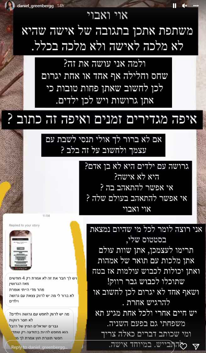 במהלך סשן שאלות ותשובות בפרופיל האינסטגרם של דניאל גרינברג. אחת העוקבות שלה הטיחה בה ביקורת לצד שאלה מאוד פולשנית. "יש לך חבר. את זה לא אמרת. רק 4 חודשים מאז הגירושים. מהר מדי הייתי אומרת. לא ברור לי מה יש לרווק לצאת עם גרושה וילדים"