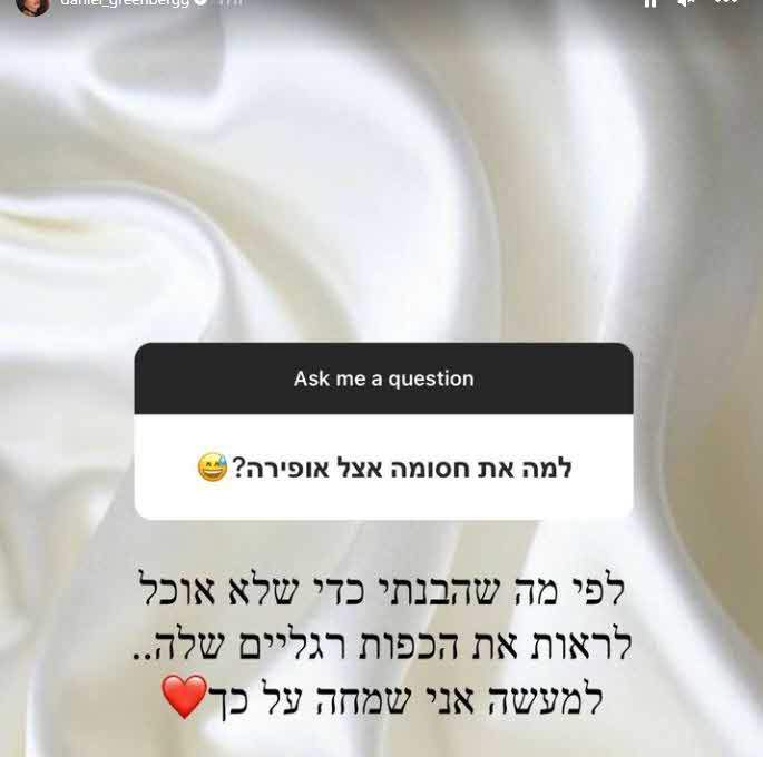 אופירה יצאה במסר חד משמעי וטענה באלגנטיות שדניאל גרינברג חסומה אצלה ולא ממש נתנה במה כדי לענות על שאלות נוספות הקשורות אליה. אמש, דניאל גרינברג החליטה לתת את המענה שלה לגבי אותה אמרה של אופירה במסגרת שאלות ותשובות לעוקבים וזה מה שהיה לה להגיד: